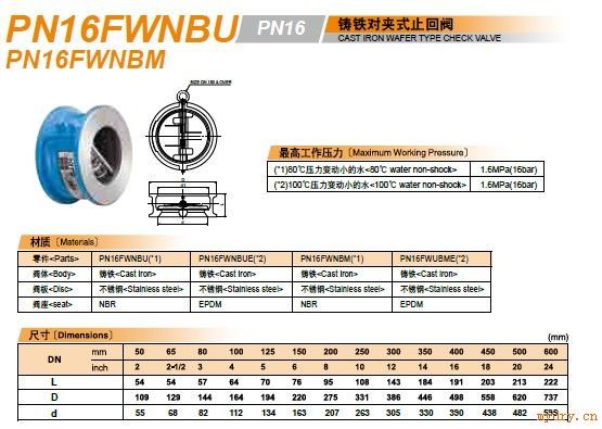 北澤球墨鑄鐵対夾式靜音止回閥 壓力:2.5Mpa 80度的水、材質(zhì):球墨鑄鐵 口徑:DN50-DN300 型號(hào):PN25SWSOBN 閥體:球墨鑄鐵.閥板:青銅、 閥座:青銅 型號(hào):PN25SWSOSN 閥體:球墨鑄鐵.閥板:不銹鋼、閥座:不銹鋼 KITZ北澤鑄鐵対夾式止回閥 壓力:1.6Mpa、100度的水、材質(zhì):鑄鐵 口徑:DN50-DN600 型號(hào):PN16FWNBU 閥體:鑄鐵、閥板:不銹鋼、閥座:NBR 型號(hào):PN16FWNBUE 閥體:鑄鐵、閥板:不銹鋼、閥座:EPDM 型號(hào):PN16FWNBM 閥體:鑄鐵、閥板:不銹鋼、閥座:NBR 型號(hào):PN16FWUBME 閥體:鑄鐵、閥板:不銹鋼、閥座:EPDM KITZ北澤球墨鑄鐵対夾式止回閥 壓力:2.5Mpa、100度的水、材質(zhì):球墨鑄鐵 口徑:DN50-DN600 型號(hào):PN25SWNBU 閥體:球墨鑄鐵、閥板:不銹鋼、閥座:NBR 型號(hào):PN25SWNBUE 閥體:球墨鑄鐵、閥板:不銹鋼、閥座:EPDM 型號(hào):PN25SWNBM 閥體:球墨鑄鐵、閥板:不銹鋼、閥座:NBR 型號(hào):PN25SWNBME 閥體:球墨鑄鐵、閥板:不銹鋼、閥座:EPDM |